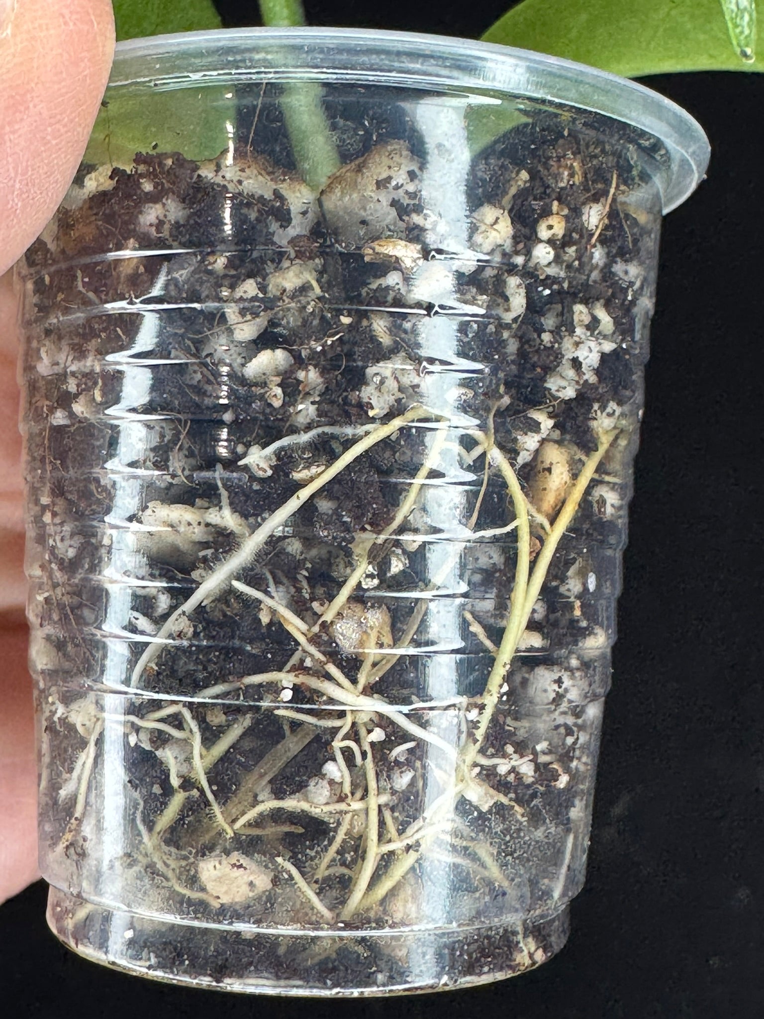 Hoya multiflora silver 'WonderPhil', silvery leaves, active growth, well-rooted in 3oz cup with mix media. One leaf with sun-burn.