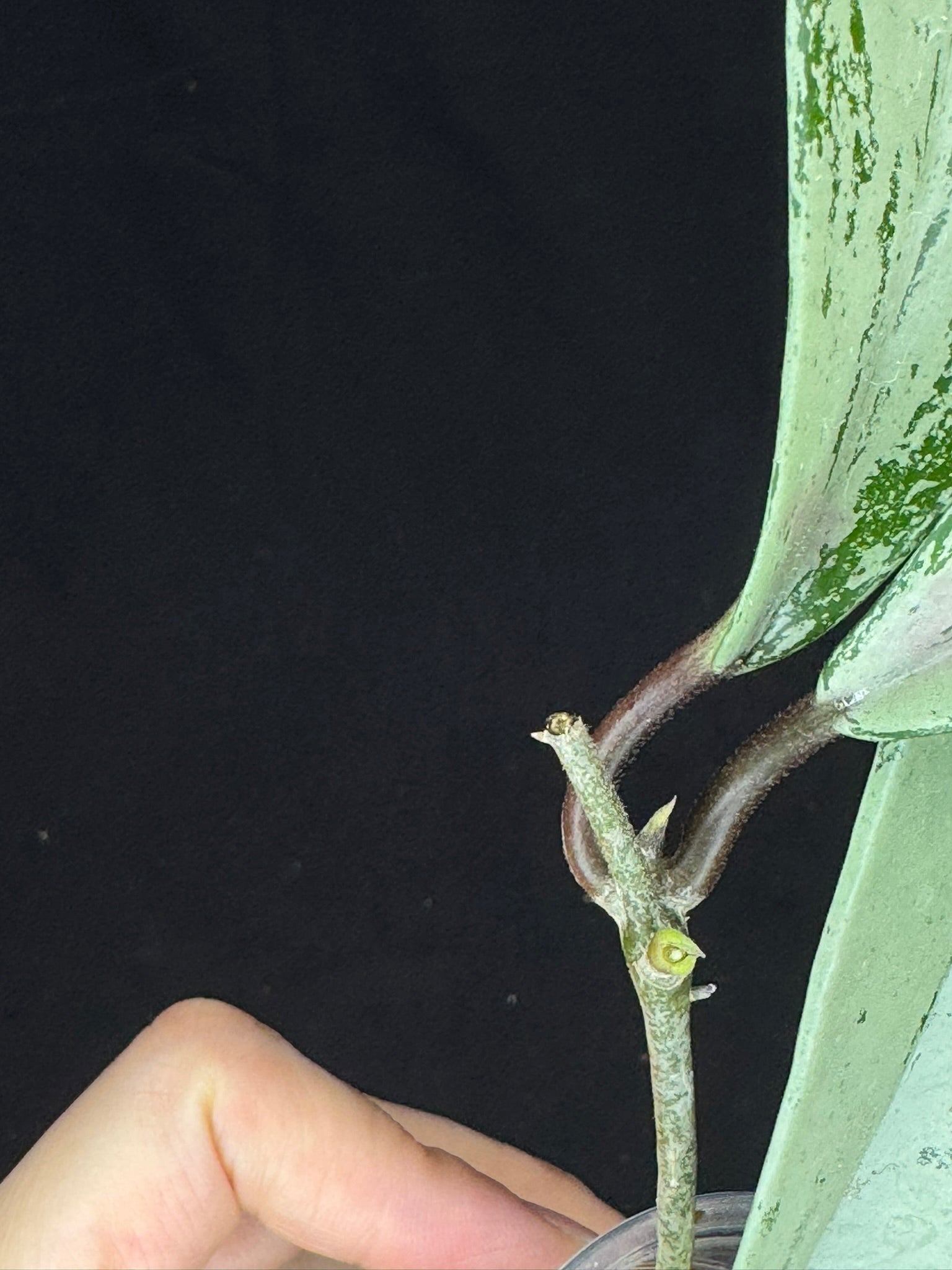 Hoya pubicalyx pink silver ghost, pure silver leaves. Rooted in 3 oz cup with PON/fluva mix. Two new growth points.